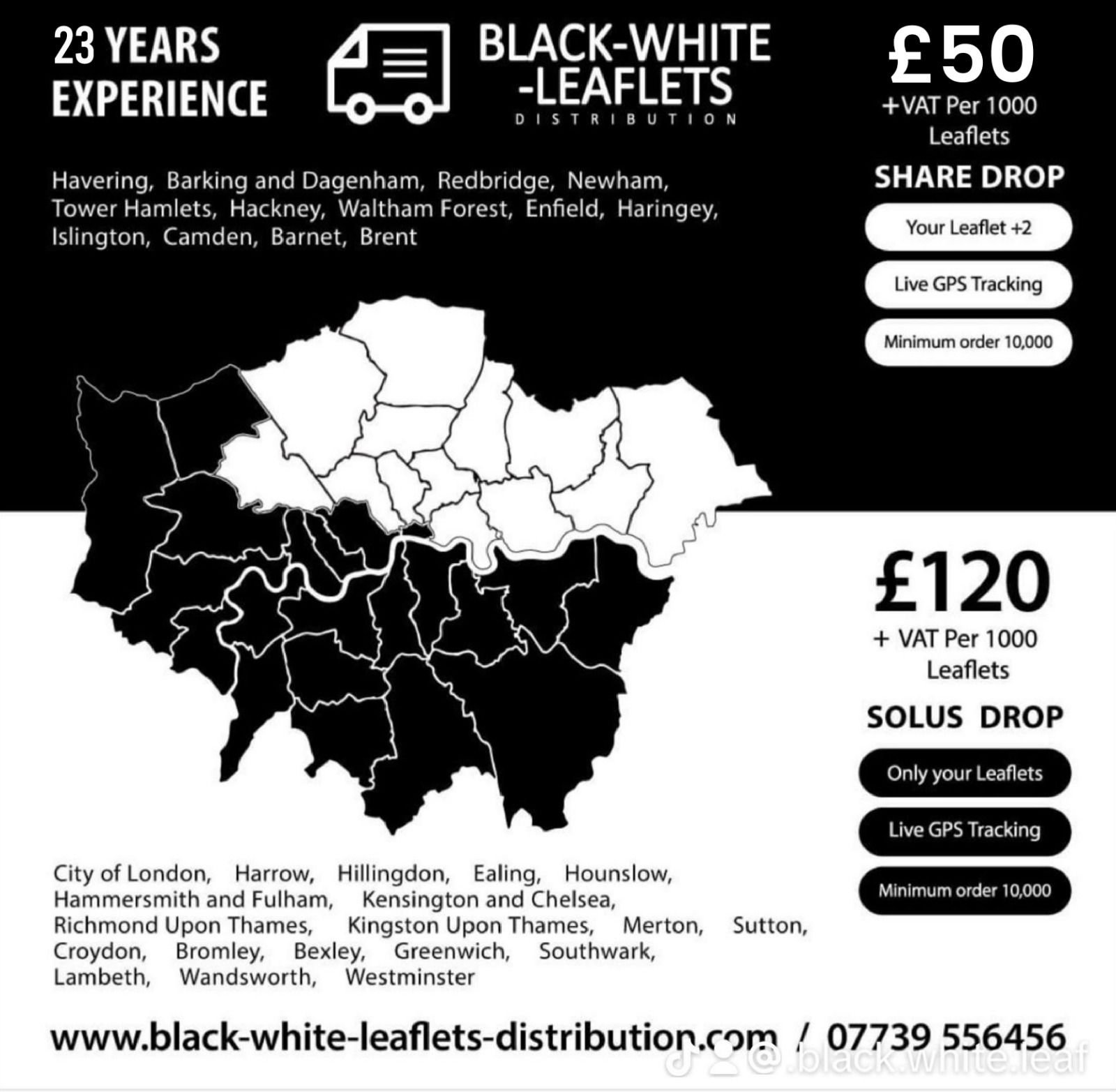 Our services cover ALL Greater London’s Borough postcodes and Essex Area (RM-IG CM-SS), positioning your leaflets directly into the hands of your target market.